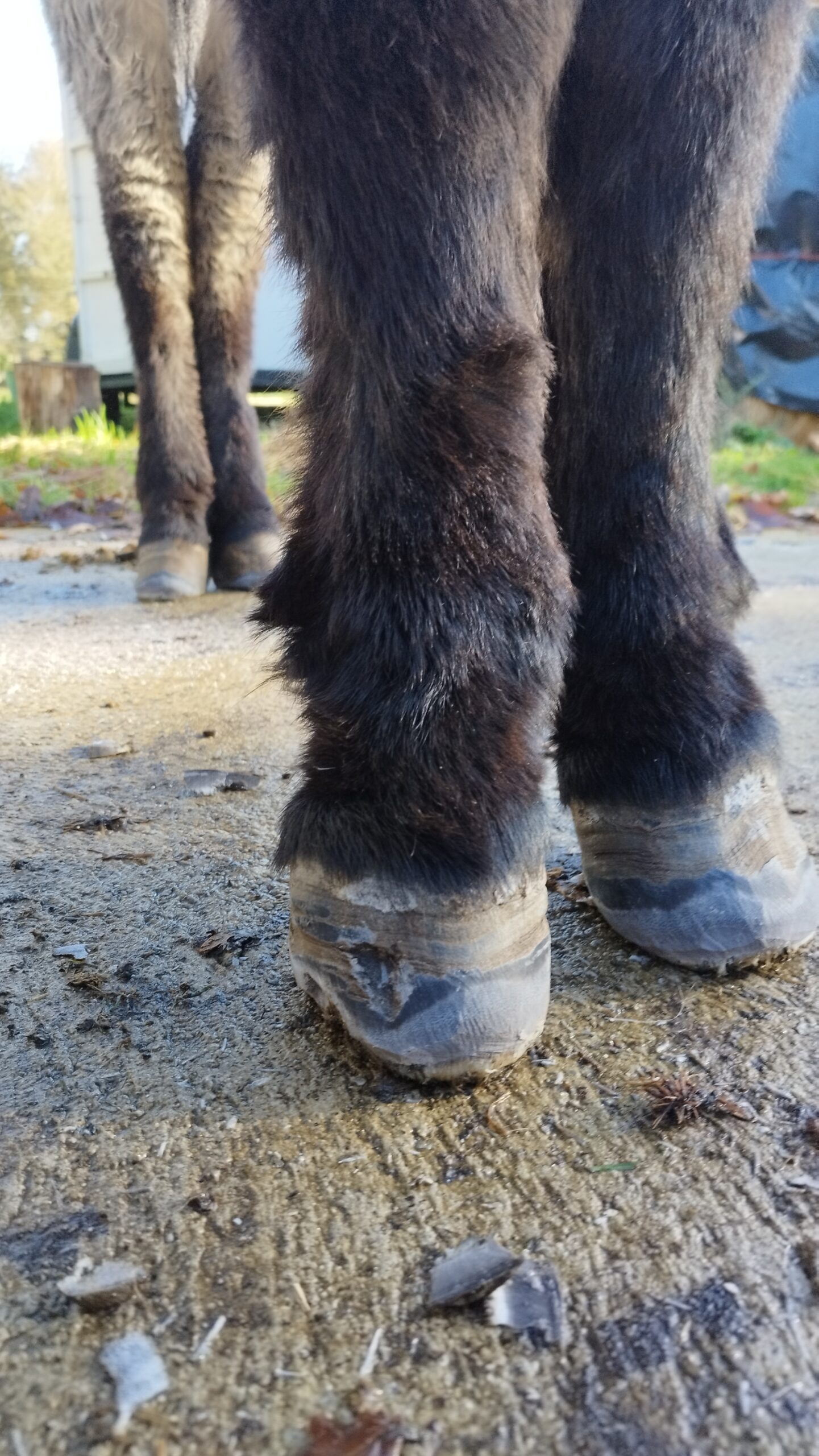 Puis dans la foulée l’arrivée d’une nouvelle ânesse de 24 ans, il s’agit de « Princesse ». Elle est toute douce mais craintive, elle s’ennuyait seule dans son pré en Normandie. Elle trouve ici une famille et Ora la fille de Bibi trouve une nouvelle maman disons plutôt une mamie. Elle l’a adoptée de suite et l’a introduite dans le troupeau et dans les habitudes de l’âne vagabond. Une vrai réussite. Si « Princesse » ne lui transmet pas trop ses craintes, ce sera une belle revanche pour toutes les deux. Il a fallu de suite s’occuper de ses pieds, il y aura encore beaucoup à y faire mais elle a l’air de se sentir bien dans ses nouveaux sabots. On a commencé à la balader. Elle s’avère excellente, elle suit , s’arrête quand il faut et repart sans difficulté et sans trop s’attarder sur l’herbe des chemins. Elle s’arrête souvent pour découvrir ce nouvel environnement. Bref, elle est très curieuse et très gentille. Elle n’a pas botté une seule fois et tout le troupeau l’a adoptée. Elle en est vite devenu la nouvelle référente. Bibi peut être tranquille, la relève est assurée.